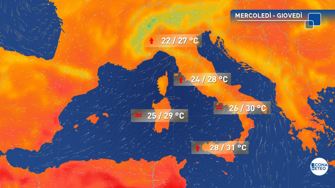 Temperature massime in lieve aumento al Nord, sulle regioni adriatiche, al Sud e sulle Isole, senza grandi variazioni altrove. Venti dai quadranti meridionali soffieranno con moderata intensità sul Salento e sul mare Ionio, di Libeccio sul mare di Corsica e sul mar ligure. Mari: mossi il Ligure e lo Ionio; poco mossi tutti gli altri bacini.