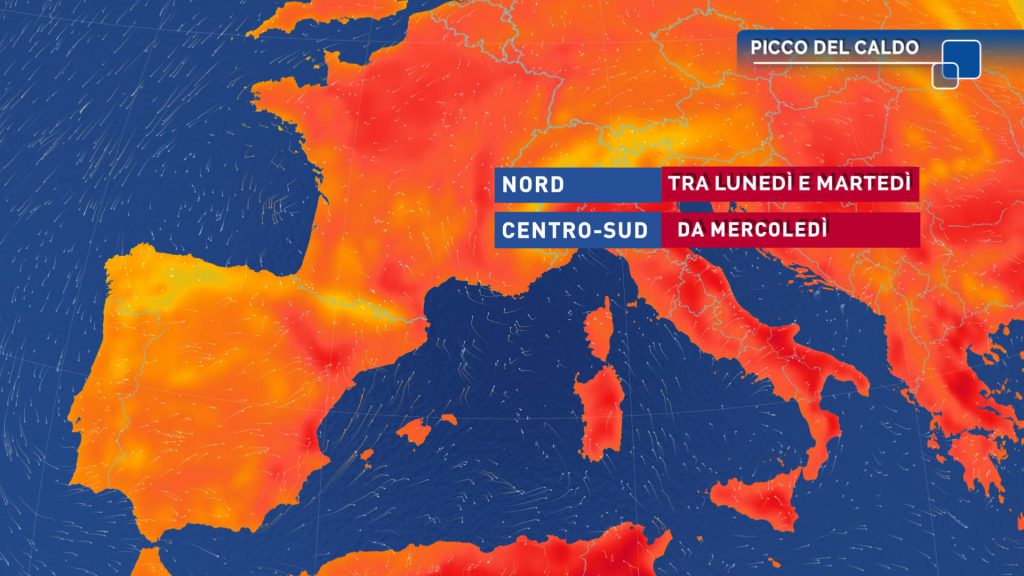 Temperature massime in lieve flessione al Nord, eccetto in Emilia Romagna, stazionarie o in lieve ulteriore aumento altrove. Valori oltre 35 gradi in Emilia Romagna e in tutto il Centro-Sud, fino a 37-38 nelle aree interne della penisola, con picchi di 39-40 su Sicilia e Sardegna. Clima molto afoso al Nord.