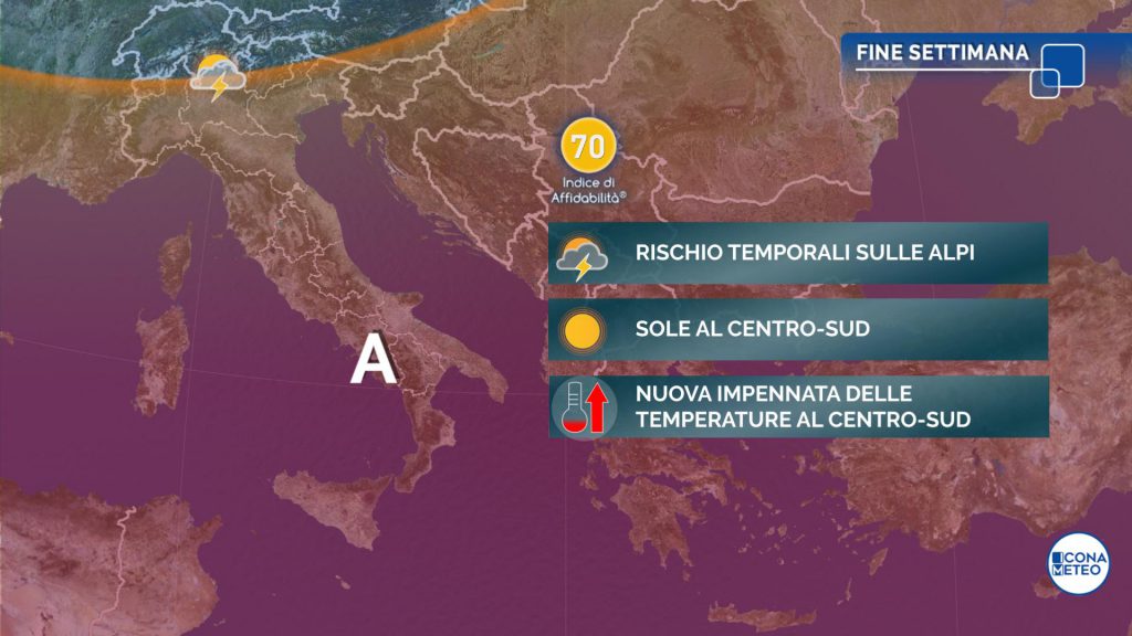 Da un lato l’anticiclone nord-africano si riporterà sulle regioni del Centro-Sud, garantendo tempo stabile e un graduale rialzo delle temperature; dall’altro ai margini dell’alta pressione, il Nord Italia vivrà giornate più instabili per il passaggio di flussi perturbati al di là delle Alpi.