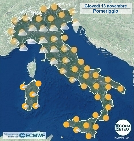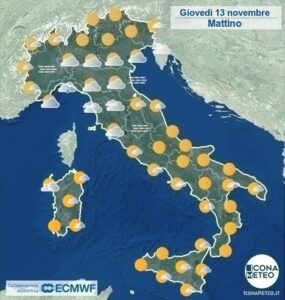 Secondo le previsioni meteo di domani, giovedì 13 novembre, il cielo sarà in prevalenza sereno o poco nuvoloso, ma non mancheranno zone più grigie. In particolare, sulla Pianura Padana, sulla Liguria, lungo le coste dell’alto Adriatico e sulla Toscana si formeranno nubi basse e nebbie persistenti, destinate a limitare la visibilità per gran parte della giornata. Al Centro possibili banchi di nebbia nelle prime ore del mattino, in dissolvimento con il sole.