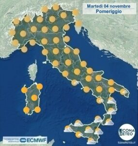 Al Sud e sulle Isole maggiori, il meteo di martedì 4 novembre sarà nel complesso buono, ma con qualche nube sparsa e locali addensamenti, specie tra Calabria e Sicilia settentrionale. Non sono previste piogge significative. I venti resteranno settentrionali, moderati su Adriatico meridionale, Salento e Ionio, dove i mari risulteranno molto mossi. Altrove, venti deboli e mari in graduale attenuazione del moto ondoso.