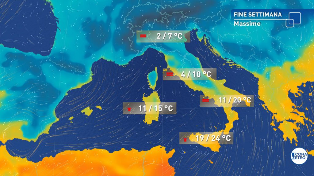 Al Nord, su Toscana Umbria e Marche si intensificherà l’afflusso di aria fredda da nordest: temperature in ulteriore lieve calo e inferiori alla norma, con valori massimi non oltre i 4-5 gradi. Per contro, si accentuerà la risalita di aria insolitamente calda nord- africana verso le regioni del Sud. Il divario termico tra le regioni meridionali e quelle settentrionali anche di una ventina di gradi.