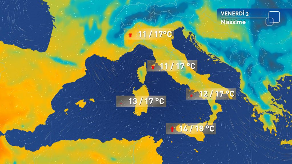 Temperature: in rialzo nei valori minimi quasi ovunque; massime in rialzo al Nord, con valori diffusamente oltre i 15 gradi al Nord-Ovest, senza grandi variazioni altrove.Venti di foehn nelle valli alpine e sulle vicine zone di pianura; moderati settentrionali sul mare Adriatico centrale al Centro Sud e sulla Sicilia; la sera sensibile rinforzo dei venti da nord o nordest sul medio mare Adriatico centro meridionale e sulle regioni del Sud. Mari: mossi o molto mossi il medio Adriatico e i bacini meridionali, poco mossi i mari centro settentrionali.