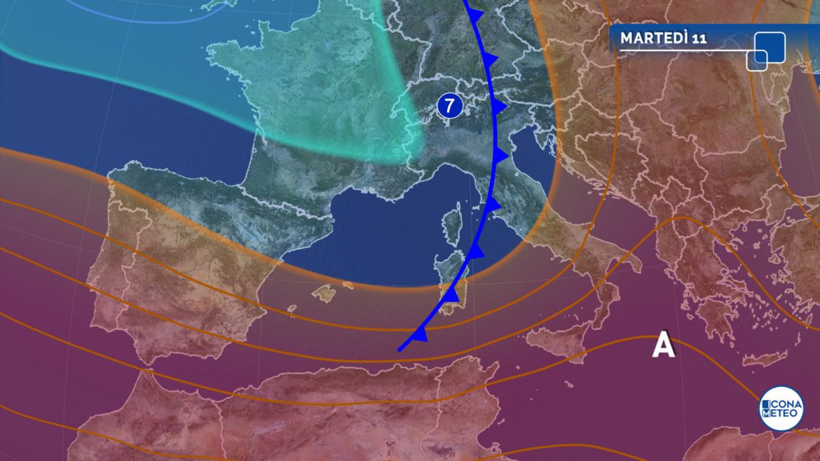 Martedì la perturbazione avanzerà lentamente verso est, coinvolgendo tutto il Centro-Nord e la Sardegna. Nella prima parte della giornata piogge diffuse interesseranno Nord-Ovest, Veneto, Trentino Alto Adige, Emilia occidentale, Sardegna (specie sul nord della regione) e Toscana occidentale; nel pomeriggio le precipitazioni si estenderanno anche al Lazio spingendosi verso Umbria e Marche; la sera piogge in arrivo anche sulla Campania ed intensificazione dei fenomeni sul Nord-Est.