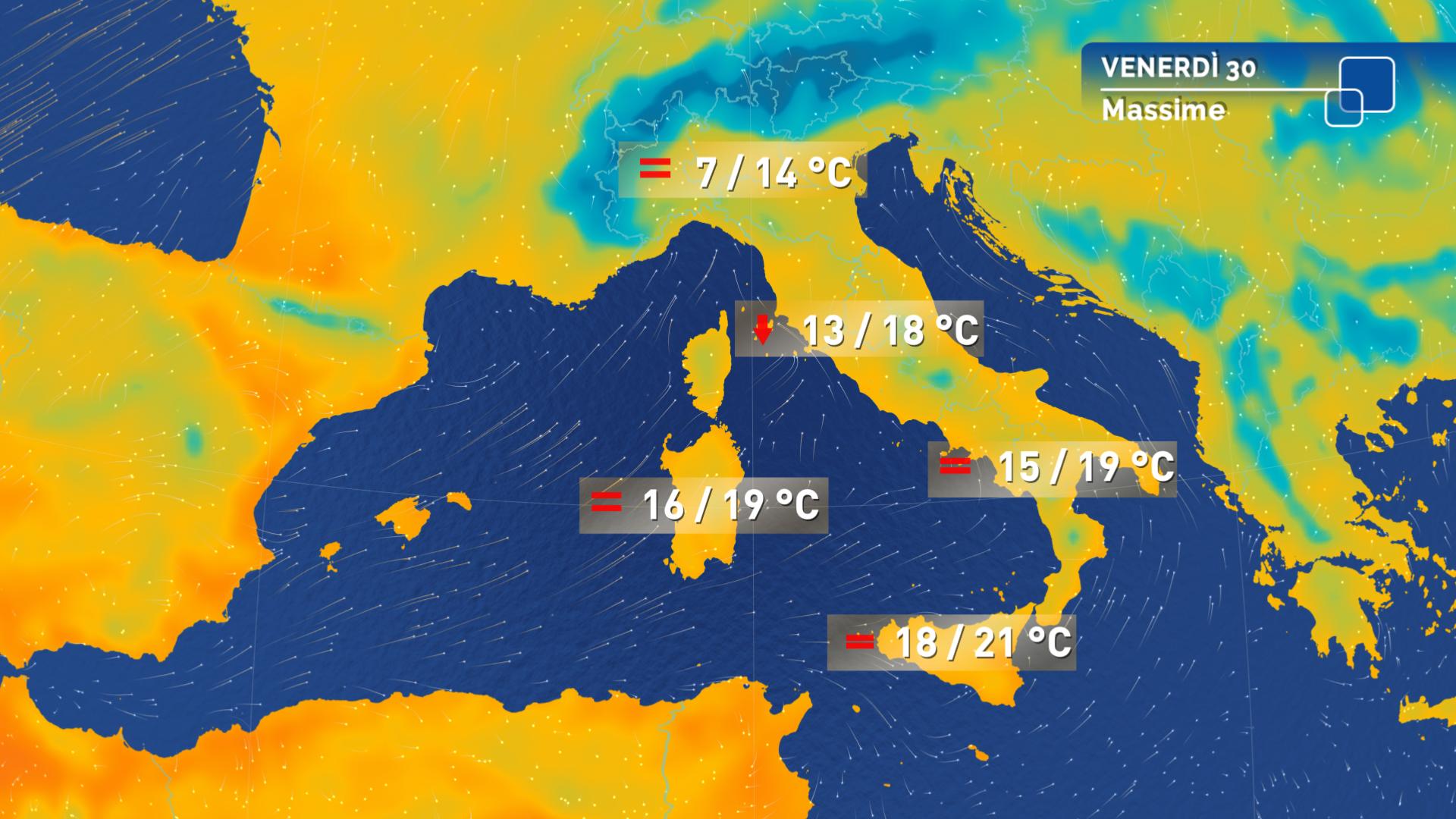 Temperature minime in crescita al Nord, in lieve calo al Centro; massime senza variazioni rilevanti e sempre miti per il periodo.