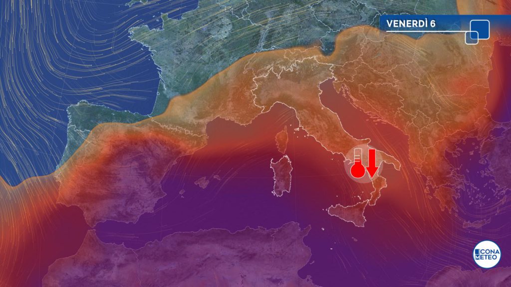 Temperature in rialzo al Nord, in calo al Centro-Sud; valori massimi per lo più compresi fra 25 e 30 gradi al Centro-Nord con locali punte di 31-32 gradi, eccetto in Puglia, settori ionici e Sicilia centro-meridionale dove farà ancora un po’ caldo con possibili picchi di nuovo oltre i 35 gradi e localmente vicini ai 40.