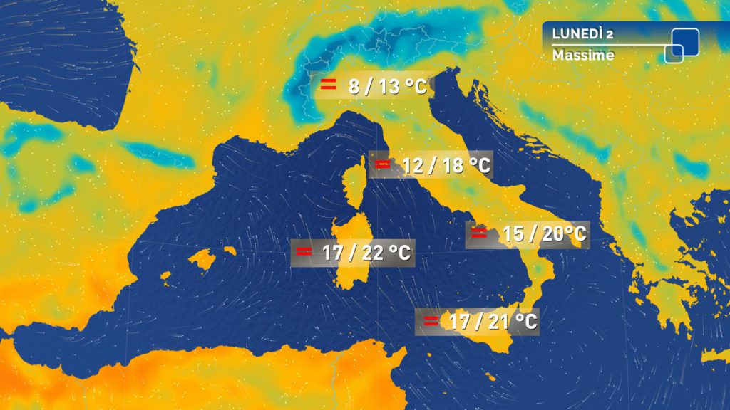 Temperature senza grosse variazioni, superiori alla norma. Venti per lo più deboli; rinforzi di Scirocco sul mar Ligure e sull’alto Tirreno. Mari: localmente mossi i mari occidentali; calmi o poco mossi gli altri bacini.