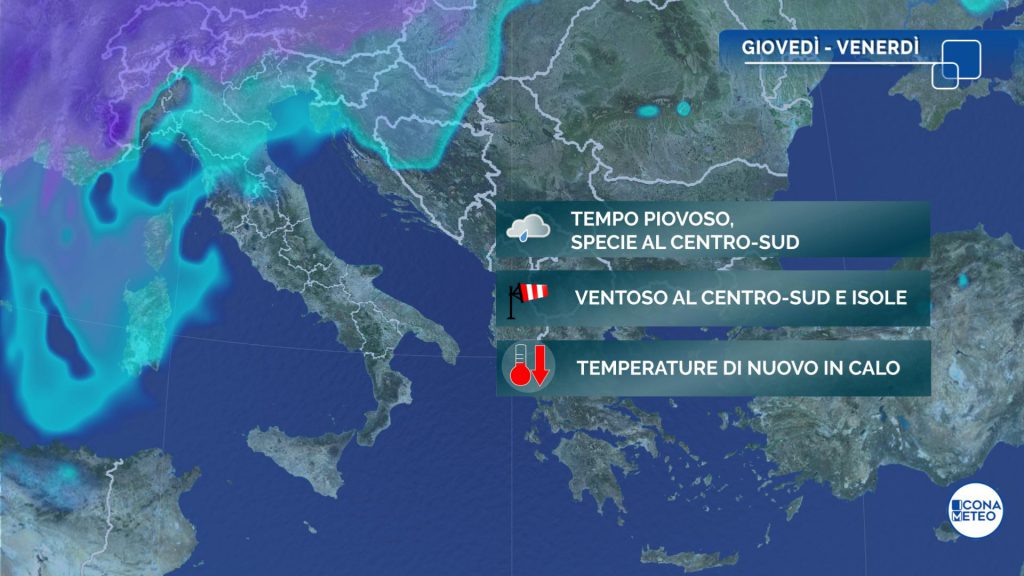 Venerdì il tempo risentirà ancora della perturbazione in transito. Sono attese piogge al Sud, in Sicilia e sulle regioni centrali adriatiche, ma i rovesci e temporali interesseranno maggiormente le regioni tirreniche. Altrove il tempo sarà in miglioramento, con cielo sereno o poco nuvoloso al Nord, Toscana e Sardegna. Le temperature massime saranno in calo sulle regioni adriatiche a causa del rinforzo di venti da nord-est.