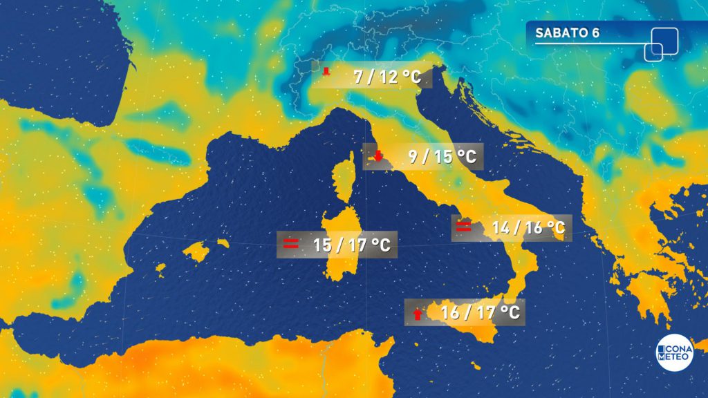 Temperature: minime in aumento al Centro-Sud, in calo nelle Alpi e all’estremo Nord-Est. Massime in diminuzione sensibile (anche di 5-6 gradi) al Nord e sulle regioni adriatiche, dove si porteranno temporaneamente al di sotto della norma; in lieve aumento su Lazio, Campania e Sicilia.