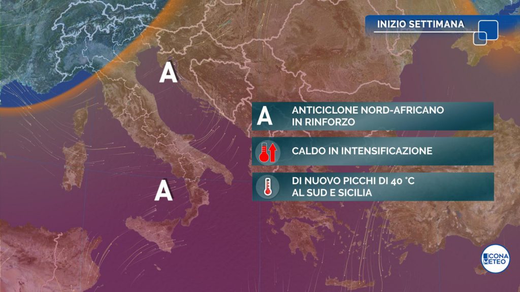 Negli ultimi giorni del mese di giugno e i primi di luglio non vedremo sostanziali cambiamenti, anzi: l’anticiclone tornerà ad espandersi sull’Italia, provocando un nuovo aumento delle temperature sul Paese. Ancora una volta a risentire maggiormente del gran caldo saranno le regioni del Sud e del Centro, dove le temperature potranno di nuovo spingersi intorno ai 40 gradi.