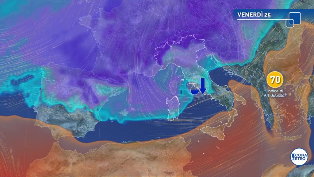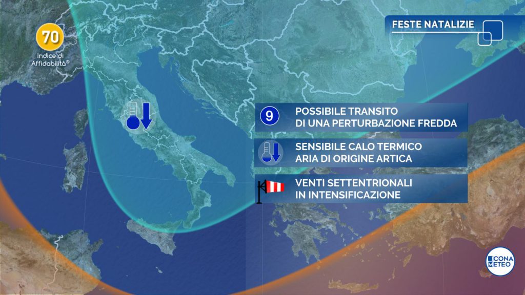 Proprio in corrispondenza del Natale l’Italia potrebbe essere raggiunta da un fronte freddo seguito da aria molto fredda di origine artica che abbasserà repentinamente le temperature ad iniziare dal Nord e con un calo anche sensibile, dell’ordine di 5-10 gradi. L’ingresso della perturbazione sul Mediterraneo attiverà forti venti settentrionali, con raffiche anche di burrasca (tra i 60 e i 70 km/h), che accentueranno la sensazione di freddo per effetto “wind chill“.