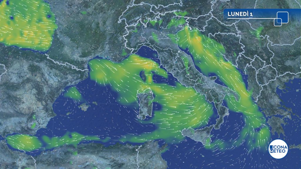 Temperature in rialzo e miti quasi ovunque nei valori minimi; in rialzo le massime all’estremo Sud, sulle regioni adriatiche e nelle Isole. Venti in prevalenza deboli sulla pianura padana; da moderati a tesi altrove, dapprima da sud o sud est, ma in rotazione da ovest sulla Sardegna e sulla Sicilia; la sera foehn nelle valli alpine. Mari: in generale mossi; fino a molto mossi il mare e Canale di Sardegna, il mar Ligure e l’alto Tirreno, l’alto Ionio e l’Adriatico settentrionale; la sera moto ondoso in intensificazione sui bacini meridionali.