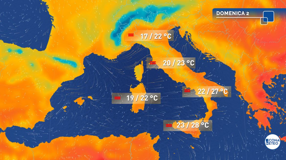 Temperature massime in diminuzione nelle Alpi, al Nord-Est, su quasi tutte le regioni peninsulari e sulle Isole maggiori. Valori ancora elevati su Puglia, settori ionici e Sicilia meridionale, dove si potranno localmente superare i 25 gradi.