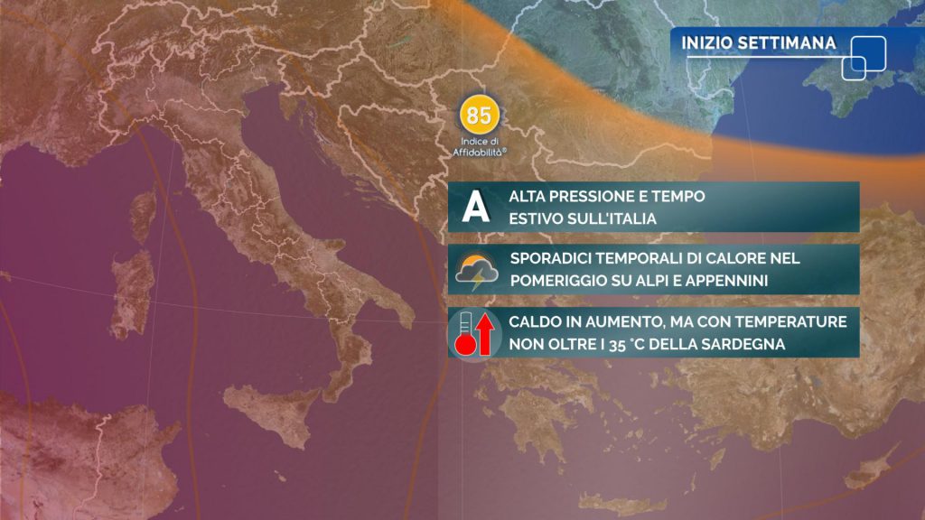 Il clima sarà pienamente estivo, con temperature in aumento soprattutto da giovedì, quando il nucleo più rovente della massa d’aria in risalita dal Nord Africa – al momento posizionato sulla Penisola Iberica – dovrebbe coinvolgere più direttamente il nostro Paese. I maggiori scostamenti dalla norma si osserveranno nei settori occidentali dell’Italia (Nord-Ovest, Sardegna, regioni centrali tirreniche).
