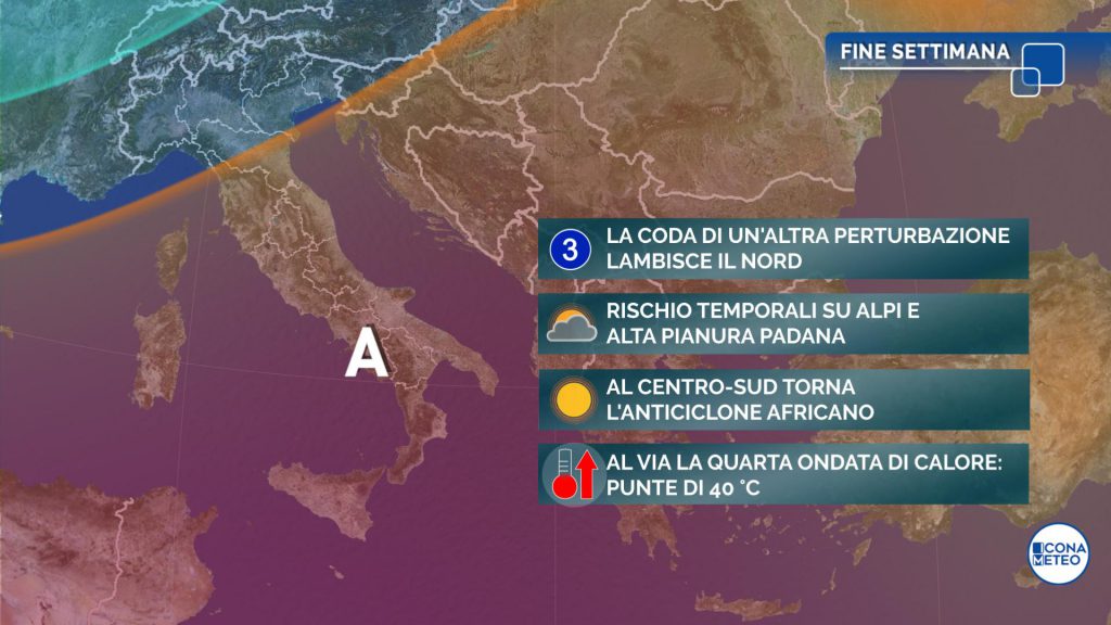 In particolare, tra sabato e domenica la coda di una nuova perturbazione (la n.3) porterà piogge e temporali prevalentemente sulle Alpi e l’alta pianura padana, mentre le temperature, soprattutto domenica, torneranno a risalire verso i 35 gradi su Emilia Romagna e regioni centrali, e verso i 40 gradi sulle regioni meridionali, decretando così l’inizio della quarta ondata di calore di questa estate. Infatti, il caldo intenso si farà sentire anche nei giorni successivi, e intorno a metà della prossima settimana potrebbe andare a interessare in maniera più diretta anche le regioni settentrionali.