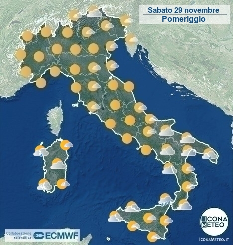 Lo scenario meteo è destinato a cambiare volto già domani, domenica 30 novembre, con il progressivo avvicinarsi della perturbazione atlantica. Al mattino il Nord-Ovest e l’alta Toscana si ritrovano rapidamente sotto un cielo più cupo, mentre sulla Liguria centrale compaiono le prime piogge. Sul resto d’Italia la situazione resta per lo più stabile, anche se il Sud e le Isole conservano una certa variabilità. Con il passare delle ore il fronte nuvoloso guadagna terreno: il Nord diventa via via più grigio, fatta eccezione per il settore adriatico, e le regioni tirreniche vedono aumentare la copertura nuvolosa. Le precipitazioni si estendono dalla Liguria alle coste toscane, poi anche alla pianura padana. Sulle Alpi occidentali tornano deboli nevicate oltre i 1300-1500 metri. Le minime risalgono al Nord, ma le massime perdono qualche grado; altrove le temperature si mantengono in lieve crescita. I venti meridionali iniziano a rinforzare, soprattutto sui mari di ponente, mentre i bacini del Sud rimangono ancora un po’ agitati.