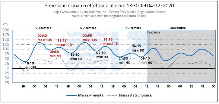 Sabato 5 la marea raggiungerà i 135 cm alle 2:40 di notte. Si tratta di un aumento che farà scattare il codice arancione per marea molto sostenuta e l’attivazione del Mose che dovrebbe ridurre l’allagamento della viabilità pedonale previsto intorno al 52%. La marea, a causa dei forti venti di Scirocco, resterà complessivamente alta in giornata: alle 8:30 è previsto un picco minimo di 95 cm (codice giallo), ma già alle 13:15 la marea dovrebbe raggiungere un secondo picco massimo, questa volta di 110 cm (codice arancione), per poi calare di nuovo intorno alle 19:30 con un minimo di 80 cm.