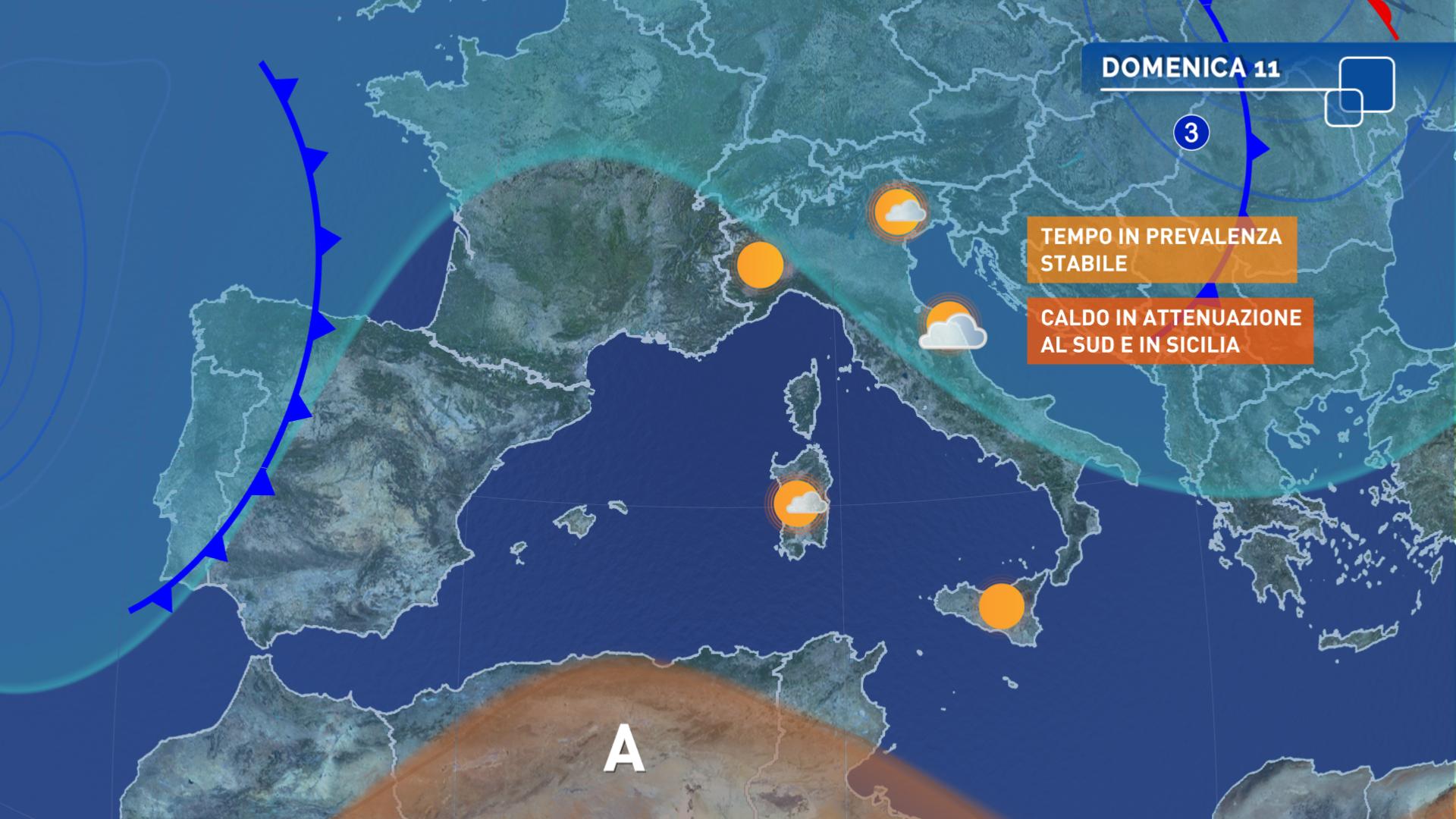 Temperature massime quasi ovunque in calo con valori più vicini alla media al Centro-Nord; punte ancora oltre i 30 gradi su Puglia, settori ionici e Isole, fino a 35-36 gradi sulla Sicilia orientale e meridionale. Venti tesi di Libeccio tra il Ligure meridionale e l’alto Tirreno; localmente moderati occidentali su Sardegna e Tirreno centrale, per lo più deboli altrove. Mari: da mosso a molto mosso il basso Ligure; localmente mossi il mare di Sardegna, il medio-alto Tirreno, il basso Adriatico e lo Ionio orientale; calmi o poco mossi tutti gli altri bacini.