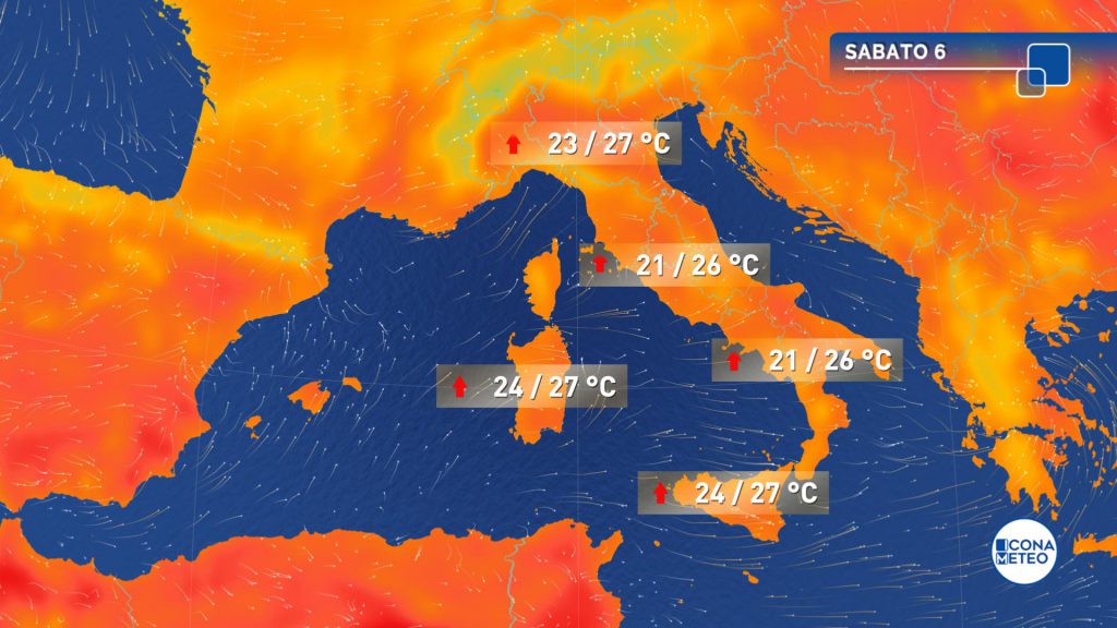 Le temperature minime faranno registrare un calo quasi ovunque, mentre le massime si presenteranno stazionarie o in ulteriore lieve aumento al Nord, in sensibile rialzo al Centro-Sud. In generale il clima sarà ovunque più caldo, con valori diffusamente fino ai 26-27 gradi.