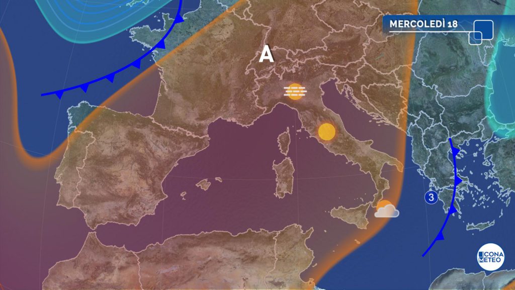 Sulle regioni centro-settentrionali e sulla Sardegna cielo in prevalenza sereno, salvo la presenza di nebbie sulla Pianura Padana e lungo le coste tra Veneto e Romagna, in diradamento quasi totale nel corso della giornata. Al Sud e sulla Sicilia nuvolosità variabile, in diradamento sulla Campania. Rovesci sparsi su Puglia, Basilicata e settori ionici di Calabria e Sicilia. A fine giornata tendenza a un generale esaurimento dei fenomeni.