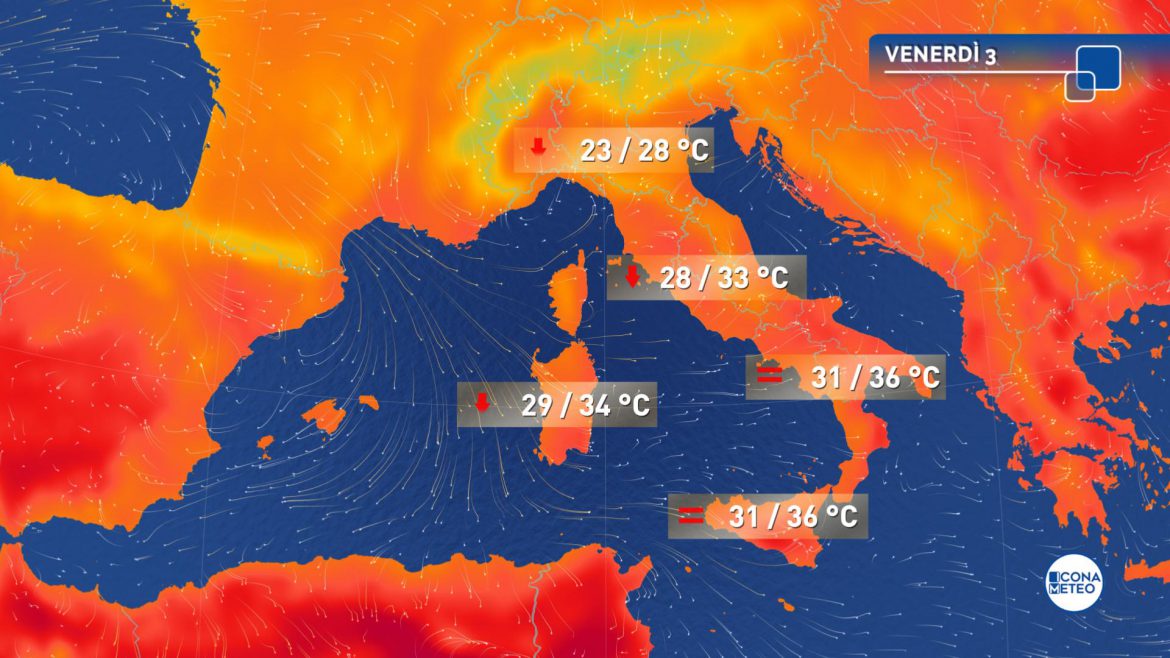 Temperature massime in sensibile diminuzione al Nord, dove in generale non si andrà oltre i 27-28 gradi; in calo più lieve anche su Toscana, Umbria, Marche e nell’ovest della Sardegna. Ancora molto caldo nel resto del Centro-Sud, in particolare nelle regioni meridionali si potranno ancora localmente toccare o leggermente superare i 35 gradi.