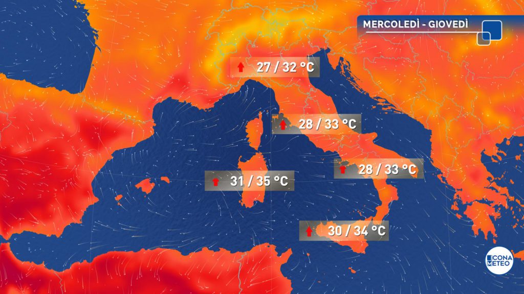 Temperature in calo sul settore alpino e sul Nordovest; senza grandi variazioni e superiori alla norma altrove. Venti: per lo più deboli; la sera intensificazione dei venti meridionali sul mar Tirreno e sul Canale di Sicilia.