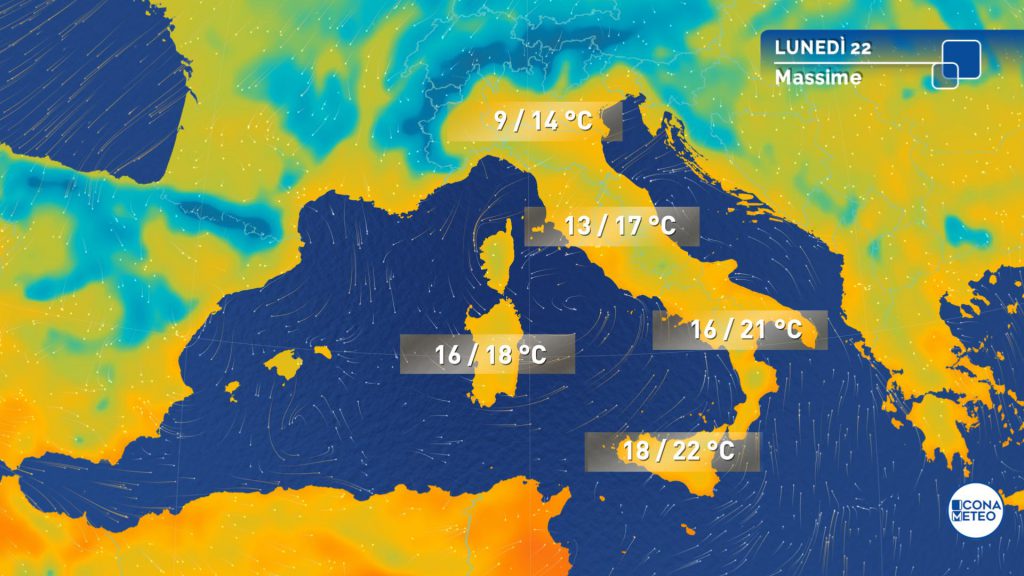 Temperature minime in generale aumento e piuttosto miti. Massime in lieve calo sulle aree alpine, sul Nordovest e sulle regioni centrali tirreniche. Venti tesi di libeccio sul mare Ionio e sul Tirreno centro meridionale; moderati da nordest sull’alto Adriatico e da nord sulla Liguria; deboli o al più moderati altrove. Mari: mosso l’alto Adriatico, mossi o molto mossi Ionio e settore centro meridionale del Tirreno; da poco mossi a localmente mossi gli altri bacini.