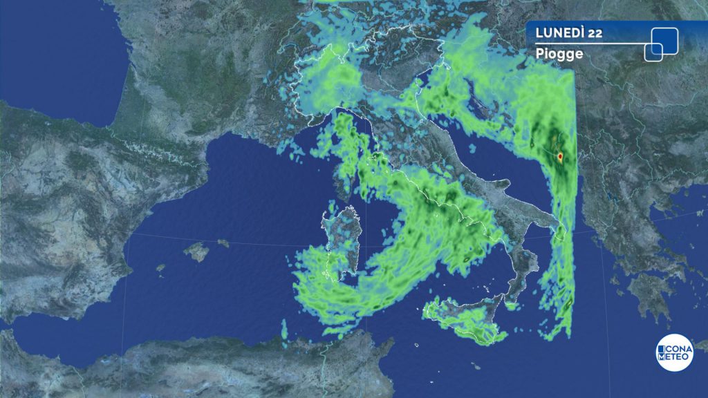 Una nuova perturbazione (n.6), giunta domenica sera sull’Italia, in questo lunedì 22 novembre darà luogo a maltempo diffuso con piogge che interesseranno molte regioni.