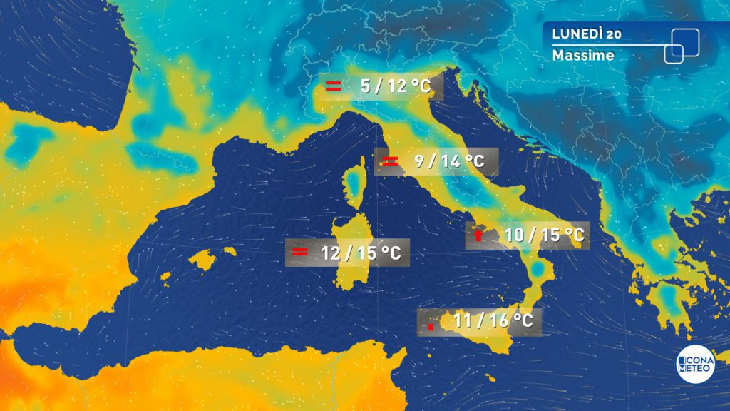 Temperature per lo più in lieve rialzo: le minime del mattino soprattutto al centro, le massime pomeridiane in particolare in Valle Padana, al Sud e in Sicilia; all’alba locali deboli gelate nelle regioni settentrionali. Venti da ovest o nordovest fino a moderati sui mari di ponente, al Sud e sulle isole; in serata venti orientali in intensificazione sull’Adriatico. Mari: fino a localmente molto mossi il basso Mar Ligure e il Canale d’Otranto; mossi o poco mossi i restanti bacini.