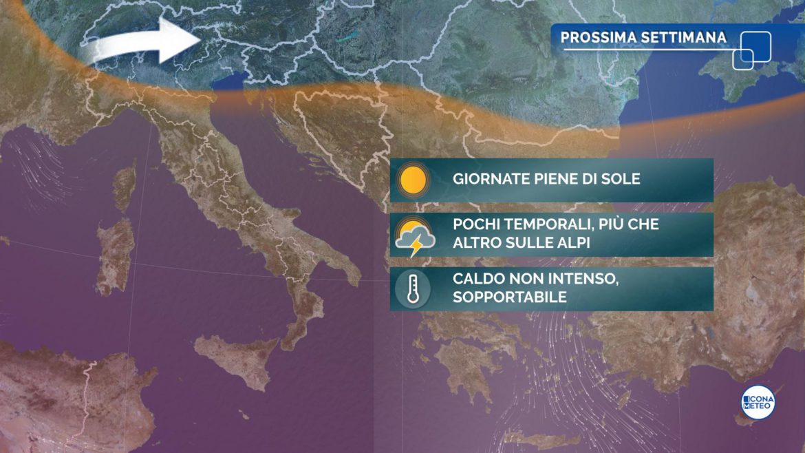 Le condizioni meteo all’inizio della settimana saranno stabili ma risentiranno ancora dell’aria più fresca portata sull’Italia dalla perturbazione numero 4 del mese. Lunedì sarà una bella giornata, con solo pochi annuvolamenti in montagna, mentre tra martedì e mercoledì si potranno verificare locali rovesci o temporali sulle Alpi. Grazie all’arrivo di venti freschi, in questa fase le temperature resteranno al di sotto dei 30 gradi al Nord e lungo l’Adriatico. Picchi di poco al di sopra dei 30 gradi saranno possibili soprattutto su Lazio, Campania, Sicilia e Sardegna.