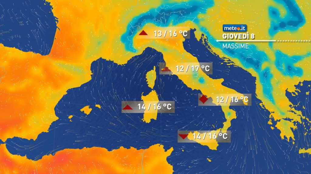 Le temperature minime saranno in calo, specie al Centro-Sud, e decisamente al di sotto della norma: soprattutto nelle regioni centro-settentrionali saranno possibili gelate diffuse anche a quote basse, che purtroppo rischiano di provocare danni alle nostre coltivazioni. I valori massimi caleranno ancora in Sicilia, mentre saranno in rialzo al Centro-Nord.