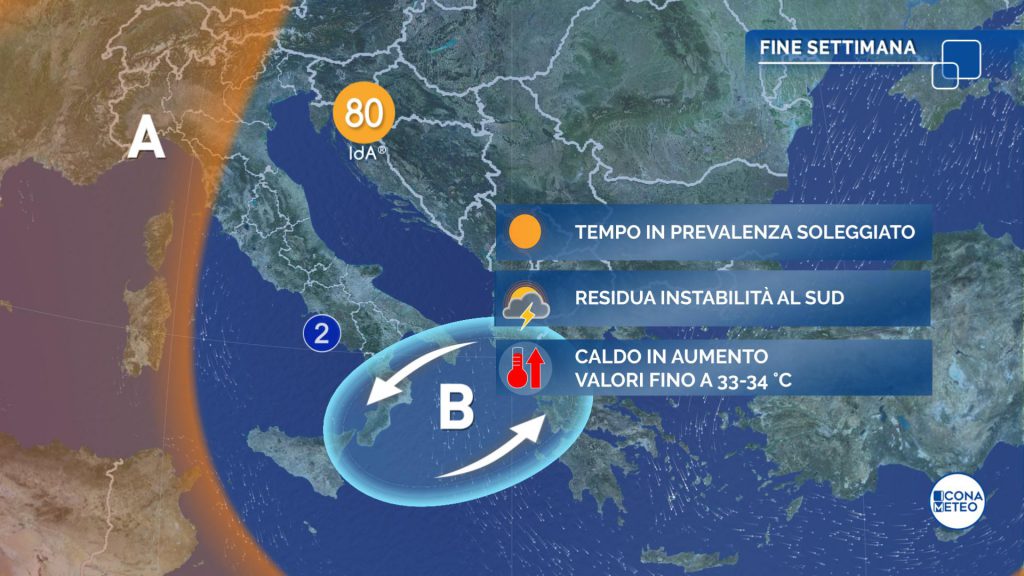 Meteo per sabato: weekend variabile e a tratti instabile al Sud e in Sicilia, con caldo in sensibile aumento. Caldo anche al Nord, con temperature tra 30 e 34 gradi. Giornata ventilata al Centro-Sud