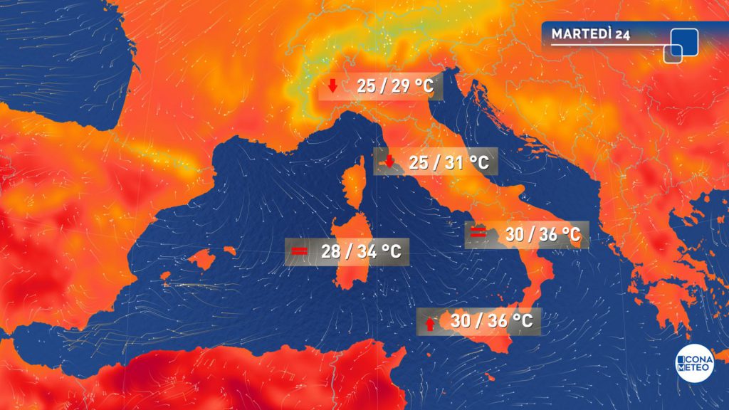 Temperature nella norma al Nord; in calo e più vicine alla media stagionale al Centro, sul nord della Puglia e in Sardegna; clima ancora molto caldo all’estremo Sud. Venti: meridionali tra il Canale di Sicilia, il basso Tirreno settore est e lo Ionio; settentrionali nel resto del Paese. Moderati di Maestrale sul mare di Sardegna, di Bora sull’alto Adriatico, di Tramontana in Liguria. Mari: localmente fino a mossi il mare di Sardegna, il Tirreno, l’Adriatico centrale e meridionali; calmi o poco mossi i restanti settori.