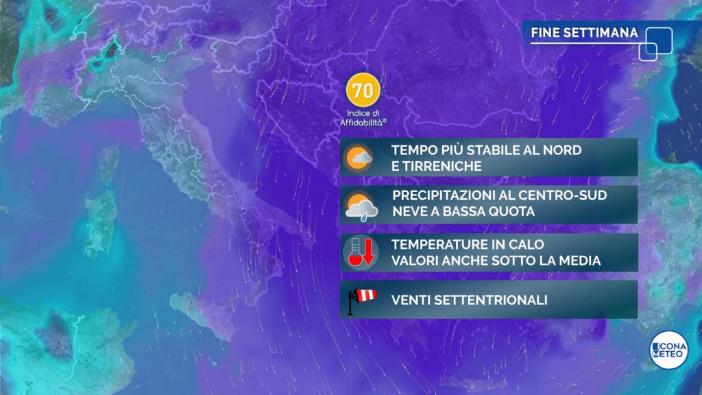Venerdì avremo una prevalenza di tempo stabile e soleggiato al Nord, in Toscana, Umbria e alto Lazio, a parte la presenza di nebbie diffuse nelle pianure e valli, in graduale dissolvimento in mattinata, e ancora un po’ di nuvole in Romagna dove non si escludono residue precipitazioni a inizio giornata. Nel resto d’Italia cielo per lo più nuvoloso con alcune precipitazioni lungo il medio e basso Adriatico, in Basilicata, Calabria, Messinese e nord-est della Sardegna; quota neve intorno ai 600-700 metri sull’Appennino centrale, 800-1200 sui rilievi del Sud e della Sicilia. Non è esclusa qualche sporadica pioggia anche in Campania e nel basso Lazio. Dal pomeriggio tendenza a un’attenuazione dei fenomeni sul medio Adriatico e Puglia settentrionale. Alla sera precipitazioni concentrate soprattutto fra Calabria e Sicilia tirrenica. L’aria sarà gelida e, per effetto del wind chill, fenomeno favorito dai venti forti, la temperatura percepita sarà prossima allo zero, specie i settori adriatici del Centro-Sud.