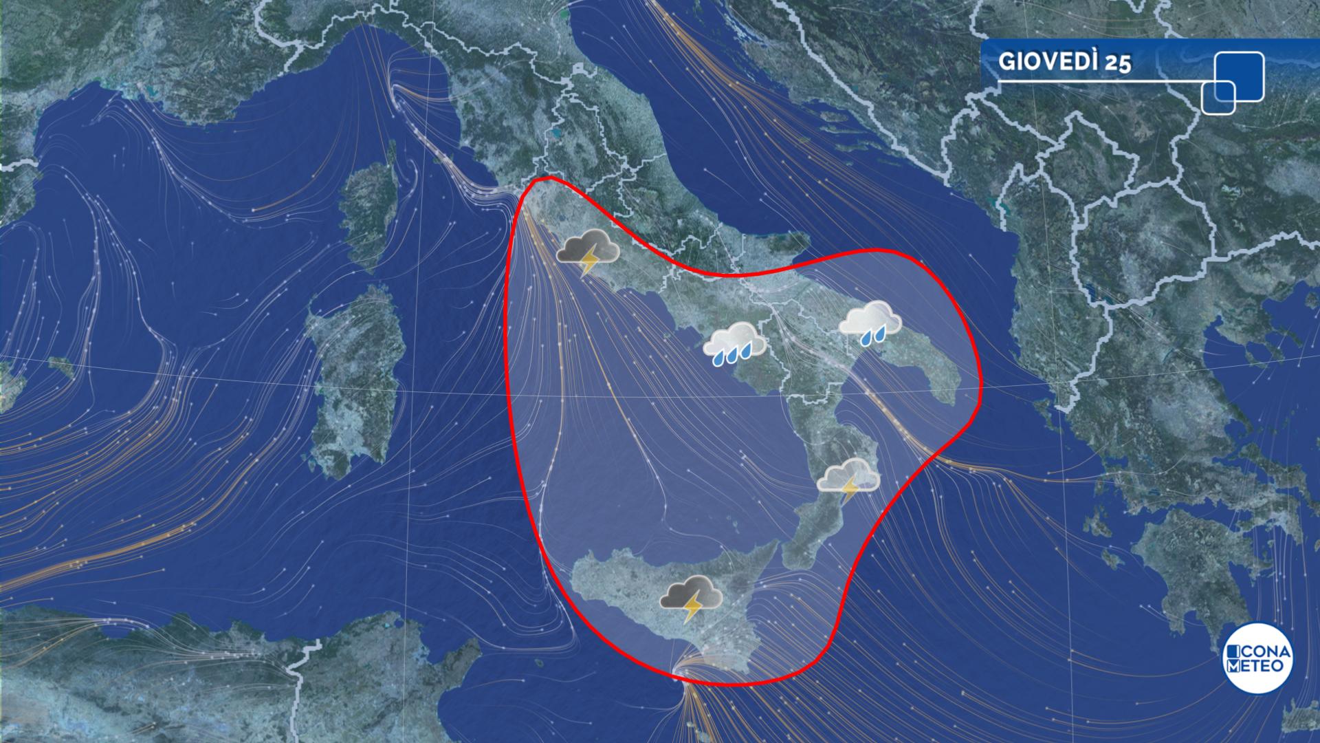Giornata all’insegna del maltempo su gran parte del Paese. Cielo da molto nuvoloso a coperto in tutta l’Italia e precipitazioni in progressiva estensione da ovest a tutte le regioni. Le piogge risulteranno più scarse, per lo più deboli e intermittenti sul medio versante adriatico, nelle Alpi centrali e sulla Val Padana centrale. Possibili fenomeni intensi, anche temporaleschi, su Lazio, Calabria, Sicilia, Sardegna e, in serata, su Lucania e Puglia meridionale; piogge localmente abbondanti al mattino anche su Liguria, basso Piemonte e Toscana, in serata sul Friuli Venezia Giulia. Neve oltre i 1100-1500 metri sulle Alpi centro-orientali, a quote più basse su Alpi occidentali, Cuneese e Appennino ligure dove la neve, al mattino, potrà scendere fino agli 800-1000 metri.