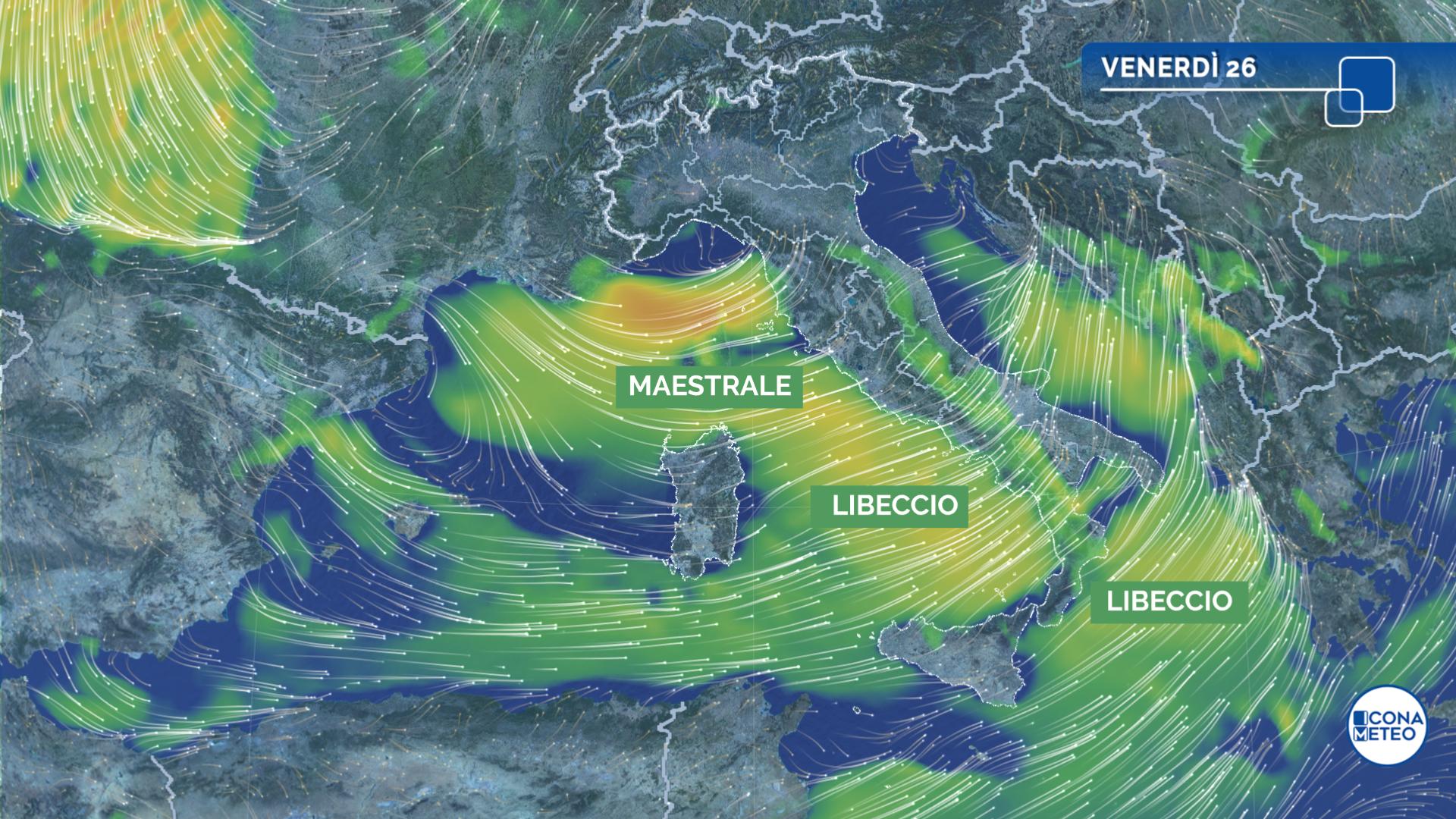 Venti da tesi a forti al Sud e sulle Isole, da ovest o nord-ovest in Sardegna, di Libeccio sul mar Tirreno, al Sud e Sicilia; dalla sera forte libeccio anche sul mar ligure; sul Centro Nord i venti saranno meno intensi. Mari: mossi l’Adriatico e i bacini settentrionali, con moto ondoso in deciso aumento sul mar ligure e sull’alto Tirreno dalla sera; molto mossi o agitati i bacini centrali e meridionali, anche molto agitati i mari attorno alla Sardegna, il medio e basso Tirreno; mareggiate lungo le coste della Campania.