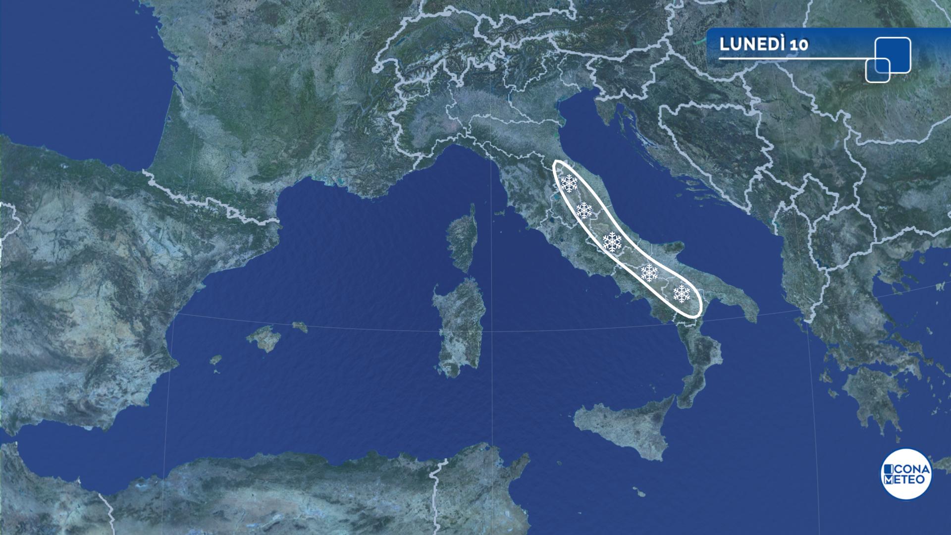 Nevicate oltre 500-600 metri sull’Appennino centrale, oltre 700-1000 metri sui rilievi del Sud e della Sicilia.
