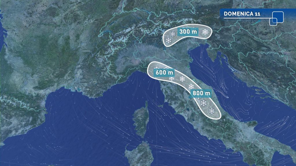 Tempo soleggiato al Nord-Ovest e nelle Alpi centrali. Parziali schiarite possibili nell’arco della giornata su Puglia, settore ionico, nordest della Sardegna, bassa Toscana e Lazio. Prevalenza di nuvole nel resto del Paese. Locali piogge e qualche breve rovescio possibili su sudest della Lombardia, basso Veneto, Emilia-Romagna, Toscana, Umbria e Marche; limite della neve fino ai 500-700 m sull’Appennino emiliano e romagnolo e a 800-1000 m tra Toscana, Umbria e Marche. Qualche fiocco di neve a quote basse anche lungo le Prealpi venete, nel Bellunese e in Carnia. Al mattino residui rovesci tra la bassa Campania e la Calabria tirrenica in successivo esaurimento. In serata qualche pioggia in arrivo nel sud della Sardegna e da ovest sulla Sicilia.