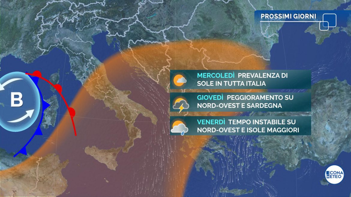 Giovedì tempo in rapido peggioramento con rovesci e temporali più diffusi e anche di forte intensità dal pomeriggio in Sardegna. Nubi in aumento fin dal mattino anche al Nord-Ovest e in Toscana con rovesci e isolati temporali nella seconda parte della giornata in Piemonte, nel Ponente Ligure, nell’Appennino settentrionale e su Alpi e Prealpi lombarde e orientali. Non si esclude qualche acquazzone anche sui rilievi tra Lazio e Abruzzo. In tarda serata aumenta il rischio di piogge e di temporali in gran parte del Nord-Ovest. Prevalenza di bel tempo nel resto del Paese con della nuvolosità su Venezie, Emilia Romagna.