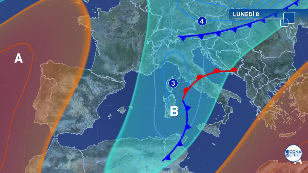 Nella giornata di domenica il tempo temporaneamente migliora anche al Centro-Sud; il vortice ciclonico (perturbazione n. 3 di novembre) rimarrà centrato sul Mediterraneo occidentale tra la Sardegna e le Baleari. Lunedì tornerà ad avvicinarsi alla Sardegna determinando così un nuovo peggioramento del tempo sulle regioni centro-meridionali. Sempre lunedì, aumenta l’instabilità e il rischio di qualche pioggia sul Nord Italia, lambito dalla coda di una perturbazione atlantica (la n. 4) in movimento verso il nord dei Balcani.