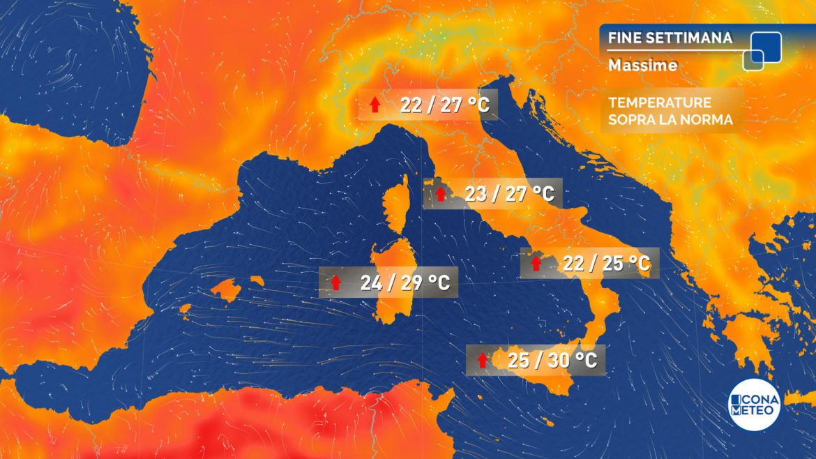 Temperature in generale lieve aumento nelle minime; massime in aumento di 1-3 gradi al Sud e nelle Isole e in generale comprese tra 20 e 27 gradi; locali punte a sfiorare i 30 nel sud della Sardegna e nell’ovest della Sicilia.