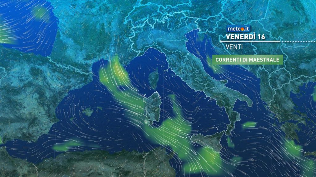 Venerdì 16 tempo instabile al Centro-Nord con nuvolosità variabile e a tratti compatta, accompagnata da piogge e temporali al mattino su Alpi centro-occidentali e localmente sulle pianure del Nord-Ovest, nel pomeriggio su Alpi, Appennino centro-settentrionale, Emilia Romagna e fasce pedemontane di Piemonte, est Lombardia e Venezie. Tempo in prevalenza soleggiato su Calabria, Sicilia e Puglia meridionale; sul resto del Sud e in Sardegna un po’ di nuvole in transito, accompagnate da brevi e isolate piogge in giornata sul nord della Campania.