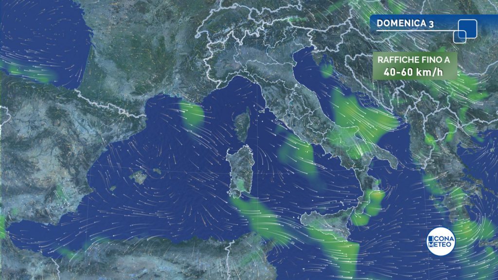 Venti fino a forti occidentali all’estremo Sud, sulle Isole e sui mari ad ovest della Penisola, con raffiche fino a 50-60 Km/h; Fohn nelle vallate alpine occidentali. Mari: mossi quelli di ponente e lo Ionio, fino a molto mossi il basso Ligure e il Tirreno; calmi o poco mossi gli altri bacini.