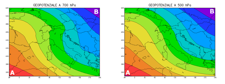 Circolazione in quota: geopotenziale a 700 hPa (circa 3000 metri s.l.m.) e 500 hPa (circa 5500 metri s.l.m.)
