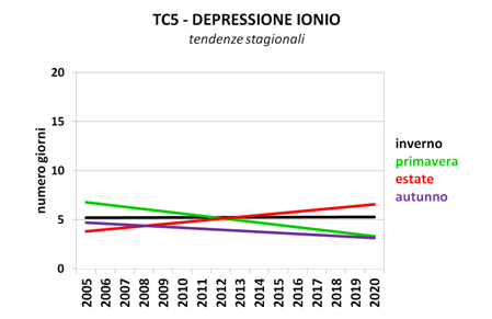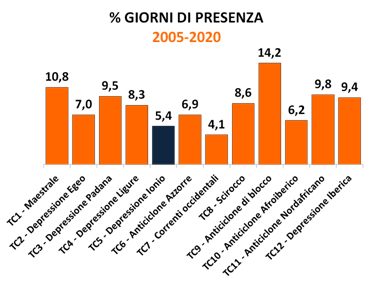 TC5 – Depressione Ionio sta diventando leggermente più frequente durante l’estate (vedi grafico delle tendenze stagionali), come nel caso di TC6 – Anticiclone delle Azzorre, al quale, come abbiamo detto, è spesso associato.