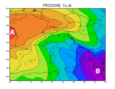 L’asse della saccatura di bassa pressione, sempre con direttrice nordest-sudovest, ha una posizione più orientale e inclinata e attraversa l’Italia all’altezza delle regioni meridionali. Le correnti che seguono l’asse gradualmente acquisiscono una curvatura anticiclonica, evidente già all’altezza dell’Italia settentrionale e della Francia meridionale. Il corrispondente promontorio di alta pressione ha il suo asse con direttrice nordest-sudovest posizionato tra Benelux, nord della Francia e Golfo di Biscaglia. Il flusso anche in questo caso impatta le barriere orografiche, dalle Alpi ai Pirenei, con componente per lo più perpendicolare, un andamento ancora favorevole al verificarsi di venti discendenti. Il gradiente barico meno pronunciato è però sintomo di episodi meno intensi sia in termini di intensità del vento prodotto che di estensione lontano dai monti nel versante sottovento (Foehn ad esempio meno impetuoso e maggiormente concentrato nelle valli alpine e nelle vicine fasce pedemontane).
