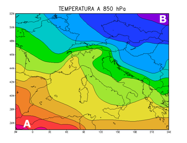 Temperatura a 850 hPa (circa 1500 metri s.l.m.)