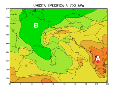 Umidità specifica a 700 hPa (circa 3000 metri s.l.m.)