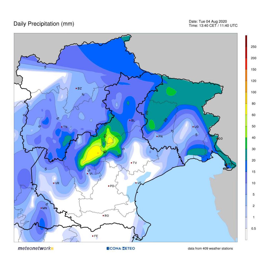 Il maltempo ieri si è abbattuto sul Veneto, colpendo in particolare la zona dell’alto Vicentino. La situazione più complicata si è verificata a Bassano del Grappa e nei comuni limitrofi, con accumuli di oltre 80 mm di pioggia, in alcune stazioni anche di ben oltre 100 mm.