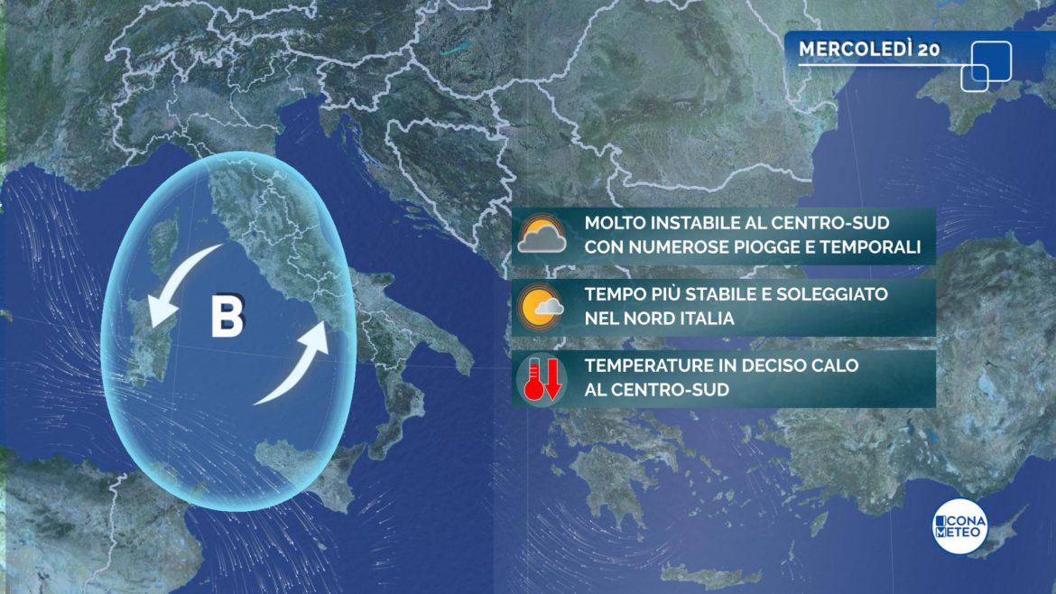 Un vortice ciclonico nella giornata di mercoledì sarà centrato sulle regioni del Centro-sud. Il tempo sarà dunque molto instabile su diverse regioni centro-meridionali e si profila una giornata di maltempo con piogge intense ma anche rovesci e forti temporali. In particolare tra l’estremo sud delle Marche e l’Abruzzo si potranno verificare piogge insistenti per gran parte della giornata con rischio di nubifragi.